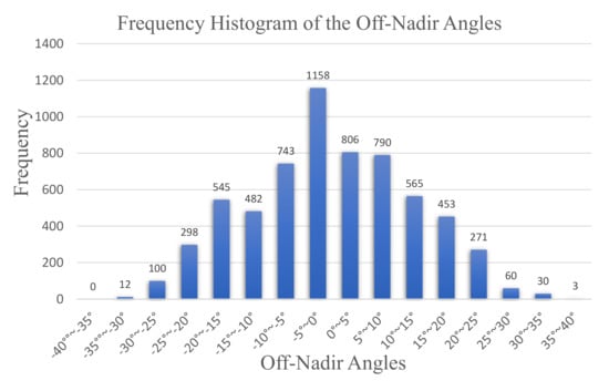 However, side-looking satellite imagery of rural areas is more difficult to collect than vertical-looking imagery of urban areas. The buildings can be imaged by satellites from different sides and projected along different angles into 2D images, as we see in Figure 3. Table 2 provides a summary of our dataset. The off-nadir angles have an average absolute value of and a standard deviation of . A frequency histogram of the dataset is also given in Figure 5. Here, it can be seen that the off-nadir angles ranged from to , with the highest frequency of 1158 clustering between and , reflecting the optimal imaging angle. Optical satellites usually have on-nadir observation angles of within to maximize their lifespan. The off-nadir mode typically relates to observation angles larger than . Our dataset consists of 71.9% on-nadir and 28.1% off-nadir image pairs. This level of variation makes it difficult for a registration algorithm to match feature points between the bitemporal images. Additionally, irrelevant structures, such as greenhouses and small reservoirs, can interfere with the building annotation process.