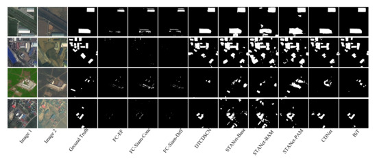 BiT [34] is an efficient change-detection model that leverages transformers to model global interactions within the bitemporal images. As with CDNet, the basic model [34] has a feature extractor and a prediction head. Unlike CDNet, however, it has a unique module (a bitemporal image transformer) that can enhance features. BiT consists of a Siamese semantic tokenizer to generate a compact set of semantic tokens for each bitemporal input, a transformer encoder to model the context of semantic concepts into token-based spacetime, and a Siamese transformer decoder to project the corresponding semantic tokens back into the pixel space and thereby obtain refined feature maps. Table 3 shows that BiT outperformed all the other methods on the two datasets. Only small prefabricated houses on hills were misrecognized, due to the lower registration accuracy, as can be seen in the fourth row of Figure 9. Most incorrect pixel predictions produced by BiT were due to side-looking effects associated with the expansion of building boundaries, which make building boundaries harder to accurately recognize in remote-sensing images.