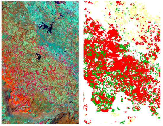 The left image is a sample of the northern province, and the right is the target image from the TH-Isan Landsat-8 corpus. Three classes comprise the target of the medium-resolution data set: para rubber (red), corn (yellow), and pineapple (green).