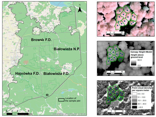 - Stereńczak, K.; Kraszewski, B.; Mielcarek, M.; Kamińska, A.; Lisiewicz, M.; Modzelewska, A.; Sadkowski, R.; Białczak, M.; Piasecka, Ż.; Wilkowska, R. The Białowieża Forest monitoring with the use of remote sensing data. In Zimowa Szkoła Leśna XI Sesja—Zastosowanie Geoinformatyki w Leśnictwie; Instytut Badawczy Leśnictwa: Sękocin Stary, Poland, 2020; pp. 99–107. (In Polish) [Google Scholar]