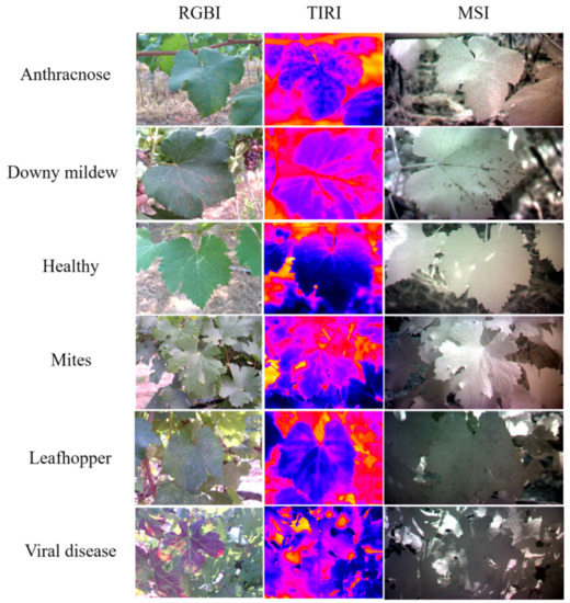 In total, 834 groups of grape foliage images were collected under rainless weather conditions with illumination from 8000 to 46,000 lux. Each group contained three types of images of grape foliage: RGBI (2592 × 1944, 3 channels), MSI (409 × 216, 25 channels), and TIRI (640 × 512, 3 channels), obtained by the RGB camera (LRCP Luoke, USB camera), MS camera with 25 bands (XIMEA, MQ022HG-IM-SM5 × 5 NIR), and TIR camera (FILR, Tau2-640), respectively. The three cameras were combined into a portable device. RGBI, MSI, and TIRI could be acquired by corresponding cameras, which were directly controlled by a portable computer while field sampling (Figure 1). During each collection of images, one grape leaf was selected to be the detection object and located in the middle of the camera view field as much as possible. The total images included six classes: anthracnose, downy mildew, leafhopper (Erythroneura apicalis Nawa), mites (Colomerus (Eriophyes) vitis), viral disease (grapevine leafrool-associated virus, grapevine fanleaf virus etc.), and healthy classes. They were collected from two regions in China: Hangzhou, Zhejiang (HZ), and Yinchuan, Ningxia Hui Autonomous Region (YC). The details of grape foliage image set are illustrated in Table 1. RGBI, TIRI, and MSI of six representative grape foliage diseases and pests are shown in Figure 2. As MSI has 25 channels, for the convenience to display, three channels with wavelengths of 896.2530, 837.1966, and 743.0255 nm were selected to compose RGBI.