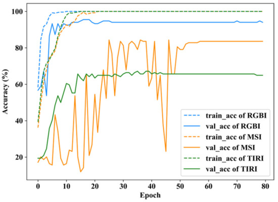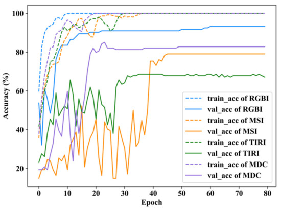 Performances of RGBI, MSI, TIRI, and MDC models in the first fold. “train_acc” means the accuracy of models on the training set. “val_acc” means the accuracy of models on the validation set.