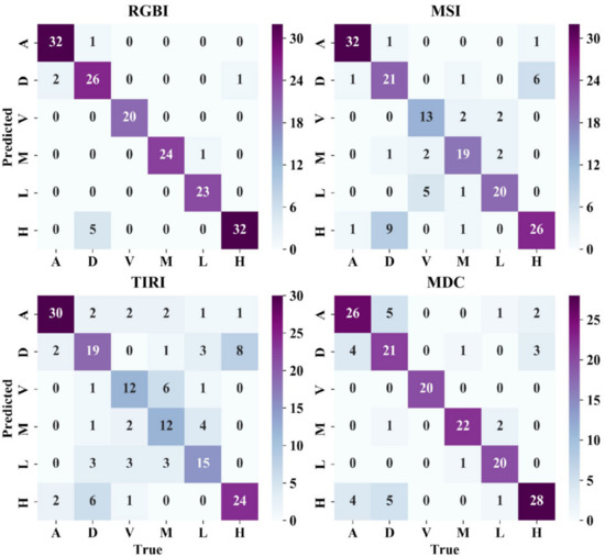 Confusion matrices of RGBI, MSI, TIRI, and MDC models on the test set in the first fold. A: anthracnose class; D: downy mildew class; V: viral disease; M: mites class; L: leafhopper class; H: healthy class.