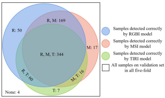 In this section, the outputs’ correctness of RGB, MSI, and TIRI models are compared. Based on the experiments in Section 3.1, the numbers of samples correctly detected by RGBI, MSI, and TIRI models on the validation set in all five-fold were analyzed (Figure 7). As shown in Figure 7, 51.57% of the total samples could be correctly detected by all three models, and 11.09% of the total samples got correct detection results uniquely by one of the three models. It cannot be ignored that 40 of 44 samples incorrectly detected by RGBI model could be correctly detected by MSI model or TIRI model. This confirmed that MSI model and TIRI model could be considered to assist the decision-making of RGBI model, so that the incorrect detections made by RGBI model could be rectified.