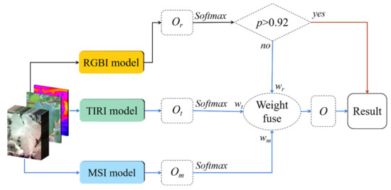 Meanwhile, as illustrated in Table 5, it could be noticed that label smoothing also inhibited the confidence of correct detection results detected by RGBI model. With label smoothing, for correctly detected samples, the proportion of p that was more than 0.95 was significantly reduced by 77.53% and only 47.97% p were over 0.9. It was an unexpected result that the outputs of samples correctly detected by RGBI model were changed and the samples were detected again because p ≤ 0.92. To overcome the problem, during the MDF decision-making process, Om and Ot would be punished because of the lower detection accuracy of the MSI model and TIRI model compared with RGBI model. Additionally, Or was more trusted to decrease the probability of misclassification of samples detected correctly by RGBI model. The data processing in MDF model based on MDF decision-making method is shown in Figure 9.