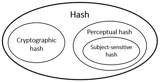 The relationship between hash, cryptographic hash, and perceptual hash is shown in Figure 2. In the category of generalized hash, although perceptual hash has many similarities with cryptographic hash, the difference is very obvious: cryptographic hash generates a hash sequence based on the binary representation of data, while perceptual hash generates a hash sequence based on the perceptual content of multimedia data.