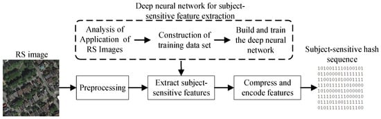The framework of the deep learning-based subject-sensitive hashing algorithm is shown in Figure 4: first, on the basis of analyzing the application of RS images, a training sample set is constructed that meets the requirements of integrity authentication; then, a suitable deep neural network is built and trained to extract the subject-sensitive features of RS images; in the process of generating a subject-sensitive hash sequence, the subject-sensitive features of the preprocessed RS image are extracted through the trained deep neural network model, and the extracted features are dimensionally reduced, coded, and enhanced to generate the final subject-sensitive hash sequence.