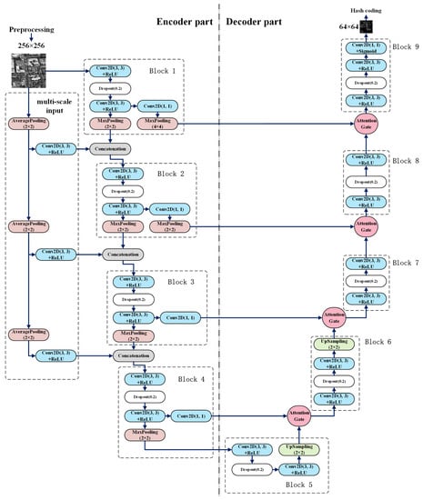 In this research, we refer to the attention gate (AG) proposed in [39] and combine the characteristics of subject-sensitive hashing to propose a deep neural network named attention-based asymmetric U-Net for subject-sensitive hashing of RS images.