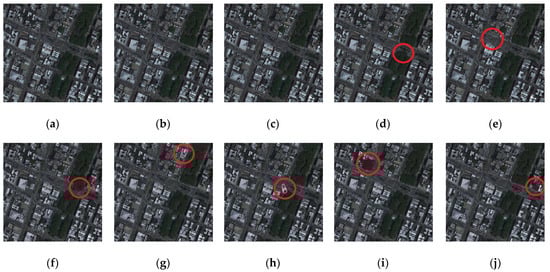 Here, we take “buildings” as the subject to compare subject-related tampering with subject-unrelated tampering—that is, tampering related to a building is “subject-related tampering”, and tampering that is not related to a “building” is “subject-unrelated tampering”, as shown in Figure 3. The comparison shows that although the size of tampering areas in Figure 3b,c is roughly the same, it is clear that the subject-related tampering shown in Figure 3b is more destructive to RS images, as the tampering in Figure 3b directly affects the user’s analysis results of RS images. However, conventional perceptual hash algorithms cannot achieve this “subject-sensitive” integrity authentication and cannot distinguish between these two types of tampering. Subject-sensitive hashing overcomes this shortcoming of perceptual hashing.