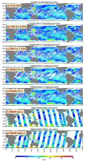 CYGNSS wind speeds as reported in different datasets for a sample day, 13 September 2018: (a) Science data record (SDR) V3.0 Fully Developed Sea (FDS) winds; (b) climate data record (CDR) V1.0 FDS; (c) CDR V1.1 FDS winds; (d) NOAA V1.0; (e) NOAA V1.1; and, for comparison, in (f,g), SMAP winds for the ascending and descending passes, respectively, on the same sample day. Areas of missing data or locations that are not sampled are depicted in white.