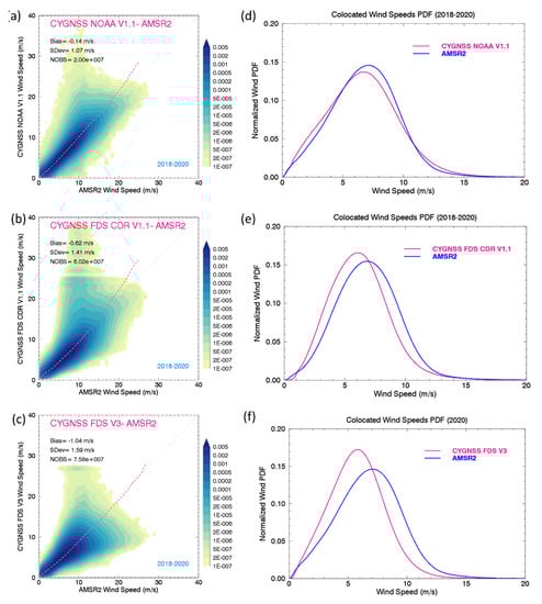 Top panels: Joint PDF of CYGNSS colocated within 60 min with the AMSR2 (global winds, rain-free, for three CYGNSS datasets); (a) NOAA V1.1; (b) CDR V1.1 FDS winds; and (c) SDR V3 FDS winds. The statistics refers to August 2018–December 2020. The joint PDFs are normalized to the total number of observations, which were binned in 0.2 m/s intervals. The pink dashed line displays the average bias as a function of wind speed between each pair of wind datasets. The thin black dotted line long the diagonal is a reference for unbiased data. Bottom panels (d–f): Wind speed PDFs for colocated CYGNSS (pink) and AMSR2 (blue) for the CYGNSS datasets displayed in panels (a–c), respectively.
