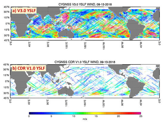There are currently only three publicly available CYGNSS datasets suitable for high wind speeds: the NOAA V1.1 (suitable at all winds and shown in Figure 2e for a sample day) and the YSLF wind products from the CDR V1.0 and the SDR V3.0. The images for these two YSLF wind products on a selected sample day are shown in Figure 5a,b. When compared to Figure 2e–g for the same sample day, but representative of any other day, these YSLF maps display the significant limitations of the two products: the SDR V3.0 YSLF are biased high in storm areas and have significant, spurious, high-biased winds in large regions over each basin, making the product unreliable at high winds; on the other hand, the CDR V1.0 winds display a more realistic distribution of the wind field, even in storm areas, but suffer from a dramatic loss of data coverage due to extremely strict quality control, which makes them practically unusable for research purposes.