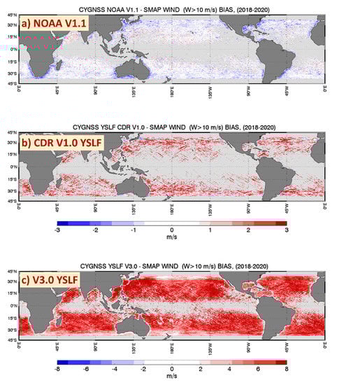 Bias maps for CYGNSS datasets suitable for high winds compared to the SMAP radiometer for wind speeds above 10 m/s: (a) NOAA V1.1; (b) CDR V1.0 YSLF; and (c) SDR V3.0 YSLF. The bias maps were determined from CYGNSS colocations with SMAP (which includes wind measurements in rain) within 60 min, for the period August 2018–December 2020. The color bars in (a,b) extend from −3 to 3 m/s; For CYGNSS V3.0 versus SMAP (panel (c)), the color bar has been extended to cover from −8 to 8 m/s due to the large biases between the two products. Light grey areas indicate no CYGNSS/SMAP observations for the selected wind range (w > 10 m/s).
