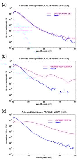 Wind-speed PDFs for the CYGNSS wind products suitable for high winds colocated within 60 min with SMAP (all-weather): (a) NOAA V1.1; (b) CDR V1.0 YSLF; and (c) CYGNSS SDR V3 YSLF winds (2018–2020). In order to emphasize the tail at high winds, the PDFs are displayed on a logarithmic scale and for wind speeds between 10 and 50 m/s.