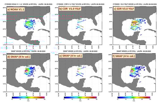 Hurricane Laura surface wind fields on 26 August 2020 from different CYGNSS datasets (a–c), respectively colocated within 4 h with SMAP (d–f): NOAA V1.1 (a), CDR V1.0 YSLF (b), and SDR V3.0 YSLF (c). The SMAP pass displayed here is at 12 UTC.