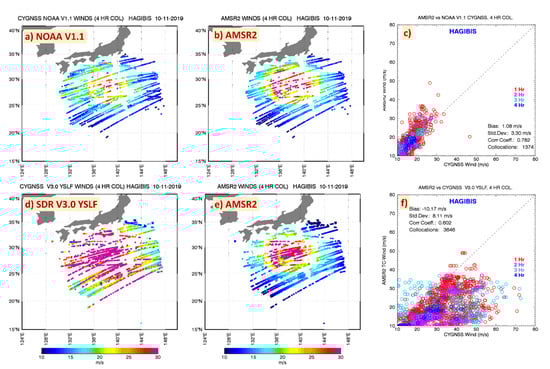 Hurricane Dorian on September 4, 2019, in NOAA V1.1 (a), and SDR V3.0 YSLF (d), colocated within 4 h with the AMSR2 TC-winds (b and e, respectively). Panels (c,f) display the scatterplot and statistics for the colocated CYGNSS versus AMSR2 winds in the TC scenes for the NOAA V1.1 and V3.0 YSLF datasets, respectively. The displayed AMSR2 pass is at 1830 UTC. The bias sign refers to AMSR2 minus CYGNSS. The scatterplots (c,f) are color-coded based on different colocation time windows, from 1 to 4 h.