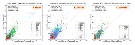 Figure 8, Figure 9 and Figure 10 provide a qualitative comparison between the 2D wind fields in some sample storms, as observed by CYGNSS and the radiometers. For a quantitative assessment, we built a database of 86 such storm scenes between 2017 and 2020 and colocated the CYGNSS observations with the radiometers within a narrower time window of 1 h. The resulting statistics for the NOAA V1.1 versus SMAP, AMSR2, and WindSat TC-winds are shown in Figure 11. When compared to these radiometers, the NOAA V1.1 winds are consistent with the radiometer TC-winds, but they display a negative bias at wind speeds above 30 m/s. Regardless of the choice of radiometer, the standard deviation is just above 3 m/s, and the correlation coefficient is above 0.75, confirming a reliable performance of the NOAA V1.1 in TCs. This suggests a need for the NOAA GMF calibration to be modified at high winds. The NOAA CYGNSS high wind performance will be revisited in the upcoming version, currently under development and planned for release in early 2022, where a modified version of ECMWF model winds, used in the track-wise sigma0 bias correction algorithm, will be used in conjunction with HWRF winds (Faozi Said, personal communication). This is expected to bring the NOAA CYGNSS high wind retrievals into much better agreement with the radiometers and with in situ measurements such as the Stepped Frequency Microwave Radiometers (SFMRs) onboard hurricane-penetrating aircrafts [].