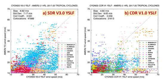 Similar to Figure 11, but for the YSLF high-wind products in SDR V3.0 (a) and CDR V1.0 (b) compared to AMSR2 TC-winds colocated within 1 h for the TC scenes in our database. Notice that the SDR V3.0 dataset starts in 2018 (see Table 1), therefore it does not include the 2017 storms. However, the scatterplot is still sufficiently populated for the statistics to be valid.