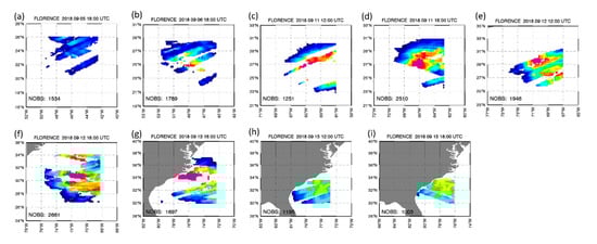 (a–i) Time series of selected scenes from the CYGNSS Storm-Centric V1.0 dataset for Hurricane Florence in September 2018. Only scenes with sufficient coverage of the storm are displayed, defined by at least 1000 valid grid points (0.1° × 0.1°). The best data coverage is on 11 September at 1800 UTC (d) and 12 September at 1800 UTC (f).