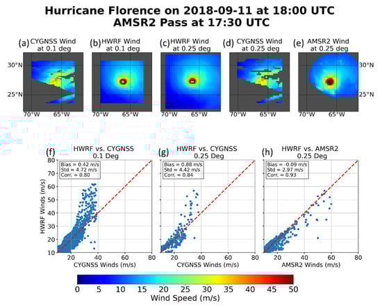 Comparison of CYGNSS storm-centric surface wind field (a,d) versus the HWRF model (b,c), with the original CYGNSS data at a resolution of 0.1° compared to HWRF resampled at 0.1° (a versus b), or both resampled at 0.25° (c versus d), for Hurricane Florence on 11 September 2018, 1800 UTC. A pass from the AMSR2 radiometer at 1730 UTC, on a 0.25° grid is also displayed (panel (e)). The bottom panels display the respective scatterplots for HWRF versus CYGNSS for the two resampling cases (f,g) and for HWRF versus AMSR2 (h).