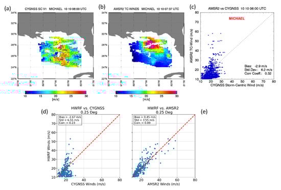Comparisons such as those presented in Figure 14 and Figure 15 and in [] give confidence in the radiometer TC-winds for intense storms and in rain. A point-by-point comparison of CYGNSS storm-centric data colocated with AMSR2 for Hurricane Michael on 10 October 2018 at 0600 UTC is displayed in Figure 16a–c, with results consistent with those seen for Hurricane Florence. The scatterplot of AMSR2 versus CYGNSS (c) is very similar to the one for HWRF versus CYGNSS (d), with CYGNSS underestimating winds above 30 m/s, and displaying a noisy and irregular storm structure. For comparison, the scatterplot of AMSR2 versus HWRF (e) shows a very good consistency between the two products.