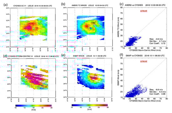 Comparison of CYGNSS storm-centric for Hurricane Leslie on 3 September 2018 (06:00 UTC scene, panel (a)), compared to AMSR2 pass at 4:55 UTC (b), and on 11 October 2018 (06:00 UTC, (d)), compared with SMAP pass at 09:36 UTC (e). Panels (c,f) display the respective scatterplots.