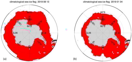 Climatological sea-ice masks near Antarctica for two sample days: (a) 13 August 2019 (Set 7-S); (b) 4 January 2019 (Set 5-S).