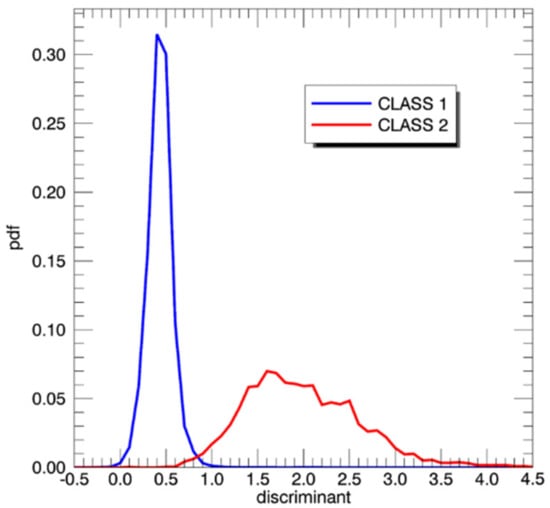 Probability density functions (pdf) of the two classes defined in Equation (5). The two pdf curves were computed for the training data sets (Table 1) and refer to case 2, which uses the AMSR2 measured minus expected specular surface emissivities as input. The x-axis values are the discriminant WT · X. The decision boundary d is at the intersection between the two pdf, which in this example is d = 0.85.