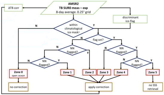 Schematic flow diagram of the sea-ice detection and flagging algorithm and defintion of the sea-ice zones 0–5.