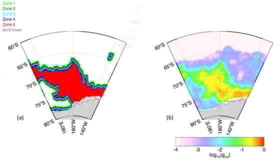 (a) Illustration of the sea-ice zones 0–5 for an area near the Antarctic ice shelf. Zone 0 (open ocean) observations are plotted white. The area near (65S, 140W) depicts a very large iceberg. (b) Antenna gain weighted sea-ice fraction gice from the OSI-SAF SIC product [].
