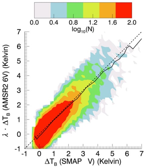 A pivotal point for the performance of the proposed flagging and correction method is the very good correlation between the SMAP and the AMSR2 measured–expected TB for the 8-day aggregate observations near the sea-ice edge. The ΔTB,0 of the two lowest AMSR2 frequency channels, 6.93 GHz and 10.65 GHz, correlate best with the SMAP ΔTB,0. This is mostly due to the fact that the higher AMSR2 frequencies are more strongly affected by atmospheric effects (i.e., water vapor and cloud water absorption), which act as noise sources in the detection and correction algorithms. Figure 7 shows a 2-dimensional logarithmic joint histogram of the SMAP V-pol specular surface TB bias ΔTB,0(SMAP V) and the scaled AMSR2 6.93 GHz V-pol specular TB bias λ·ΔTB,0(AMSR2 6V) for the test set scenes (Table 1) within sea-ice zones 1–4. The scaling factor λ can be determined from a linear regression and is found to be λ = 1.15. The correlation coefficient is 0.96 (Table 4). Similar values are found (Table 4) for the correlation coefficients between the ΔTB,0(SMAP V) and the sea-ice correction terms ΔTB,corr,1 and ΔTB,corr,2 that were derived in Section 2.4. It is because of these high correlations, and the fact that the AMSR2 TB are insensitive to SSS, that we can employ them for sea-ice flagging and sea-ice correction in the SMAP SSS retrieval algorithm.