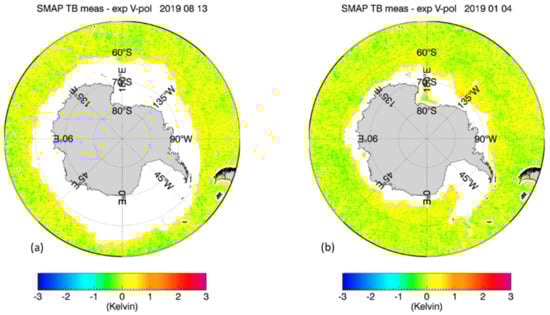 - One of the major assumptions when using the AMSR2 TB to flag and correct the sea-ice contaminated SMAP TB was that the spatial resolutions of the SMAP and the AMSR2 TB measurements are similar. When averaged over eight days, the different orientations of the antenna footprints at a certain location have less of an impact. This means that SMAP and AMSR2 see approximately the same Earth scene. That assumption is of course only approximately fulfilled, and in reality, there is some spatial mismatch between the SMAP and the AMSR2 observations. It is possible to reduce this uncertainty source by resampling the SMAP and all the AMSR2 channels to the same target location and the same spatial resolution by employing the Backus-Gilbert optimum interpolation technique []. This resampling would use a polar stereographic projection for selecting the target locations, which is better suited than a regular 0.25° grid in polar regions. This is a project that is currently being considered, but it will require considerable effort.