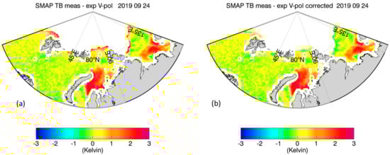 SMAP V-pol TB biases for an Arctic test scene on 24 September 2019 (Set 8 from Table 1). (a) before flagging and correction in zones 0–3; (b) after flagging and correction showing zones 0–2. The large red areas indicate freshwater river outflows. These areas are not affected by the sea-ice flagging and correction algorithms.