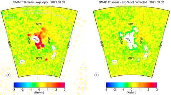 SMAP V-pol TB biases for an area around the South Georgia Islands near the Antarctica on 02 March 2021 (Set 9 from Table 1) that was affected by the very large drifting iceberg A-68 []. (a) before flagging and correction; (b) after flagging and correction showing zones 0–2.