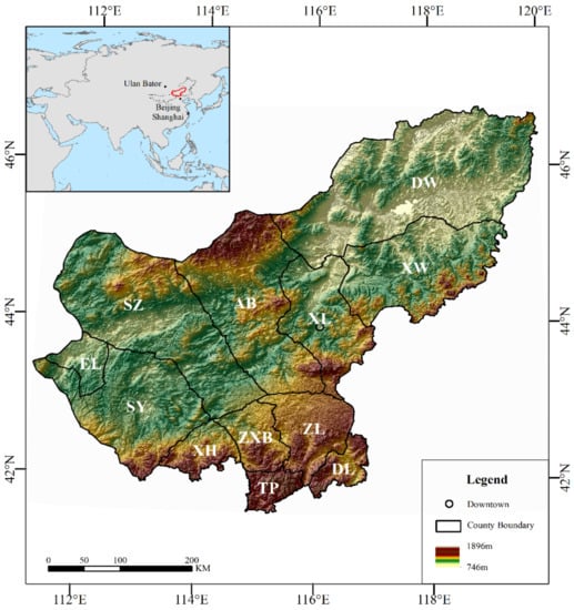 The general landscape of the Xilingol region consists of gently undulating hills, plateaus, and dunes; the elevation gradually decreases from south to north, with an average altitude of 800–1800 m; it is bordered by the northern foothills of Yin Mountain in the south and the Gobi of the Mongolian Plateau in the north; it is a zone of transition from the arid northwest to the humid east and a sensitive area in responding to global change [].