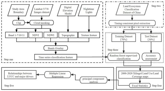 In response to the above issues, our study aims to implement a long time-series, high-accuracy land-use mapping of Xilingol by using Landsat remote-sensing image data since 2000 with a random forest classification algorithm and then investigate the relationship between LULC and climate and regional socioeconomic development factors of Xilingol by using principal component analysis and multiple linear stepwise regression methods. The specific objectives of this research are: