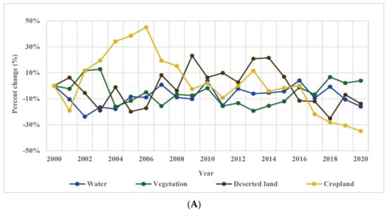 Temporal characteristics of LULC across Xilingol from 2000 to 2020. (A) Cropland, vegetation, deserted land, water; (B) vegetation (high-coverage grass, moderate-coverage grass, low-coverage grass).