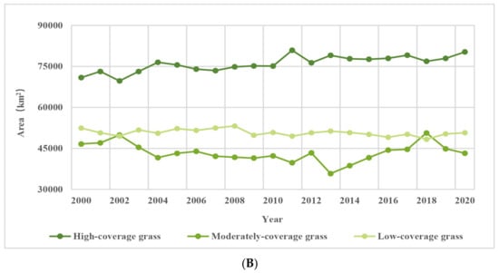 From 2000 to 2020, the ecological status in Xilingol indicated significant characteristics of improvement. In particular, the area of natural vegetation (grassland and woodland) increased slightly (+4.42 × 103 km2, +3.95%), but the area of deserted land, water, and cropland presented a shrinking trend (Figure 5A). Of the natural vegetation, high-coverage grass continued increasing; moderate-coverage grass decreased first and then increased, but the total area remained decreased; low-coverage grass gradually decreased (Figure 5B).