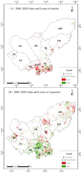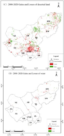 Spatial patterns of land-use gains/losses during 2000–2020. (A) Cropland; (B) vegetation; (C) deserted land; (D) water. Notes: DW: Dongwuzhumuqin, XW: Xiwuzhumuqin, XL: Xilinhot, AB: Abaga, SZ: Sunitezuo, SY: Suniteyou, EL: Erlianhot, XH: Xianghuang, ZXB: Zhengxiangbai, ZL: Zhenglan, DL: Duolun, TP: Taipusi.
