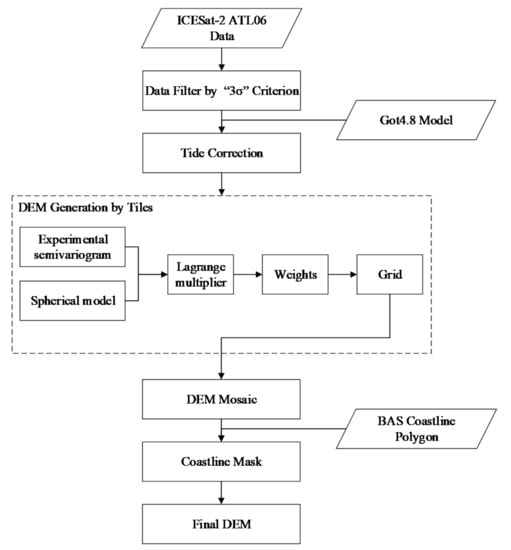 RIS, FRIS, and AIS DEMs at resolutions of 100 m using the ordinary kriging method based on ICESat-2 measurement points from October 2019 and October 2020 are generated by processing as Figure 3.