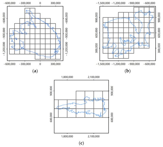 The 100 km by 100 km tiles of RIS, FRIS, and AIS DEMs. Maps are in the polar stereographic projection in meters. The small grey box in the diagram (a–c) represents the tile of division.