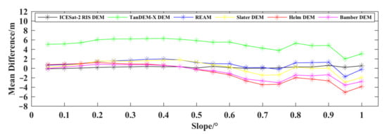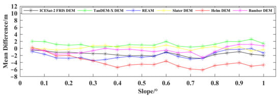 Mean difference between ICESat-2 RIS DEM as well as the five Antarctic DEMs and OIB elevations. The horizontal coordinate is the slope of the surface from 0° to 1° with an interval of 0.05°.