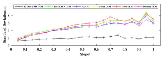 Standard deviations between ICESat-2 RIS DEM as well as the five Antarctic DEMs and OIB elevations. The horizontal coordinate is the slope of the surface from 0° to 1° with an interval of 0.05°.