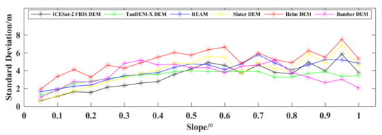 Standard deviations between ICESat-2 FRIS DEM as well as the five Antarctic DEMs and OIB elevations. The horizontal coordinate is the slope of the surface from 0° to 1° with an interval of 0.05°.