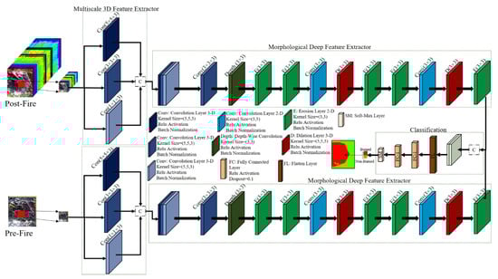 The deep features are extracted by convolution layers, and the arrangement of the convolution layers and their diversity has caused many deep-learning-based methods to be proposed [55,56,57]. Presenting the informative structure of convolution layers can be a major challenge. In this regard, the present study presents a novel framework based on standard 3D, 2D, and depthwise convolution layers, with their combination with morphological layers. As illustrated in Figure 2, the method proposed here has two deep-feature extractor streams. The first stream investigates the pre-fire dataset, and the second stream explores the deep features from the post-event dataset. Each stream includes 2D-depthwise, 3D/2D standard convolution layers, and morphological layers based on erosion and dilation operators. Initially, the deep-features extraction is based on 3D multiscale convolution layers, and then the extracted features are fed into the 3D convolution layer. The main advantage of 3D convolution layers is to take the full content of the spectral information of the input dataset by considering the relation among all of the spectral bands. Furthermore, the multiscale block enhances the robustness of the DSMNN-Net against variations in the object size [12]. The multiscale block uses a type kernel size of convolution layers that increase the efficiency of the network. The expected features are reshaped and converted to 2D feature maps, and then the 2D-depthwise convolution layers are used. Next, the hybrid morphological layers based on 2D dilation and erosion combine with 2D convolution layers to explore more high-level features. For this, first, we use two erosion layers, and then the 2D convolution layer and dilation layers are used (see Figure 2). Finally, the 2D convolution, erosion, and dilation layers have been used in the last part of the morphological deep-feature extractor. The extracted deep features are concatenated for two streams and then they are flattened and transferred to two fully connected layers, and finally, the soft-max layer is entitled to decide the input data. The main differences between the proposed architecture and other CNN frameworks are: