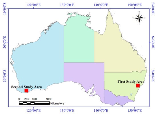 Both study areas in this research were located in the Australian continent. The main reason for choosing the areas was the availability of the PRISMA hyperspectral datasets for these areas. Reference is the most important factor in the evaluation of BAM results. Thus, the reference data were obtained based on visual analysis and the interpretation of the results of BAM in previous papers. Figure 3 presents the locations of two study areas, in the southern Australian continent.