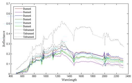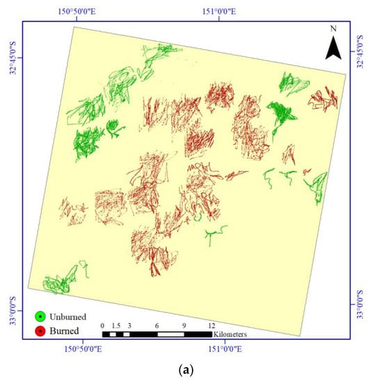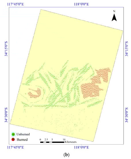Gathering of sample data is required to estimate the burned area due to using a supervised learning method. The quality and quantity of the sample data have a key role in BAM. In this study, the numbers of the sample data were kept at a sufficient level for the two classes (i.e., burned areas, unburned areas). Figure 6 shows the spatial distribution of the sample data.