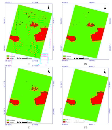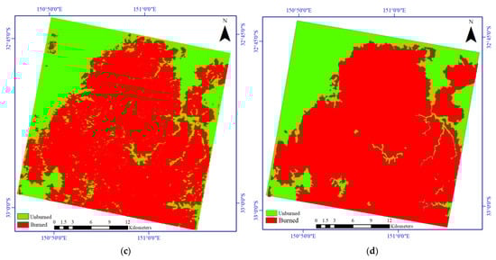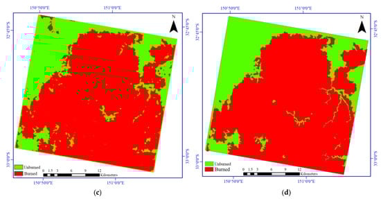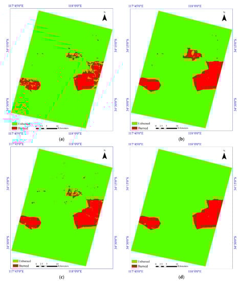 Visual comparisons of the results for the burned area mapping based on the post/pre-event Sentinel-2 imagery for the second study area. (a) Deep Siamese network. (b) Using the CNN method proposed in [42]. (c) Using the method proposed in the present study. (d) Ground truth map.