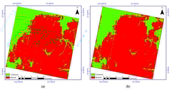Burned area mapping based on the low and medium resolution of satellite imagery is common in the RS community. In recent years, many studies have used BAM based on Moderate Resolution Imaging Spectroradiometer (MODIS), Sentinel-3, Medium Resolution Imaging Spectrometer (MERIS), and Visible/Infrared Imager Radiometer Suite (VIIRS) [29,30,31]. However, while these sensors have a high temporal resolution, they suffer from low spatial resolution. Accurate BAM for small areas is a major challenge due to the mixing of pixels. Furthermore, the complex diversity of scenes can result in spectrum gains in one burned pixel to be mixed with some other material. Furthermore, these are based on ruleset classification and manual feature extraction such that the extraction of suitable features and the finding of optimum threshold values are time consuming.