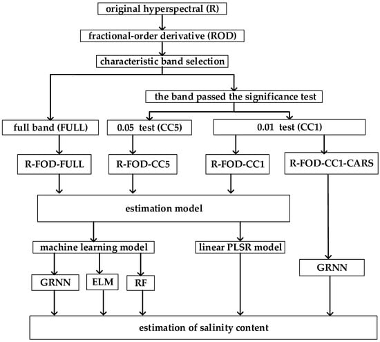 Characteristic band selection method is a crucial step for the establishment of soil salinity content prediction model. The goal of the characteristic band extraction is to discover the bands that have more ability to reveal the correlation between the spectroscopy and salinity. Therefore, four bands (R-FOD-FULL, R-FOD-CC5, R-FOD-CC1, and R-FOD-CC1-CARS represent the full band variables, the band passed the 0.05 significance test, the band passed the 0.01 significance test, and CC1 combined with CARS, respectively) have been choose as the input feature variables to develop the soil salinity estimation model. Finally, four models (GRNN, ELM, RF, and PLSR) were utilized to build the estimation model. The flow chart is shown in Figure 3.